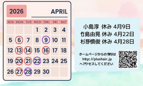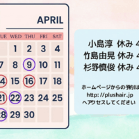 こんにちは、Plushairです😊2026年4月の営業日カレンダーをお知らせいたします。春になり、お出かけや新生活のスタートな…