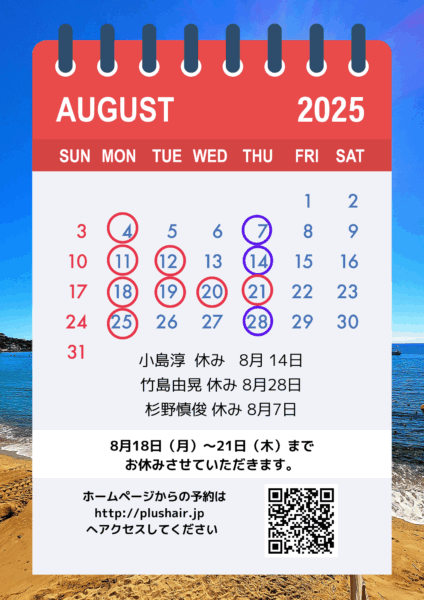 今月は【8月18日(月)〜21日(木)】まで、スタッフ一同リフレッシュ休暇をいただきます🙇♀️