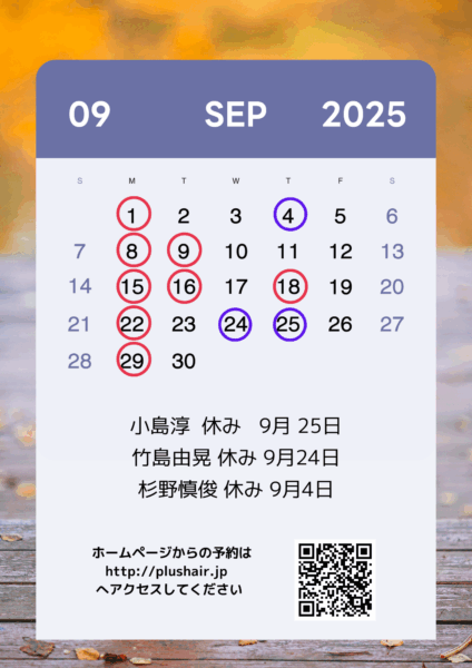 【Plushair】2025年9月の定休日とスタッフのお休みのお知らせ